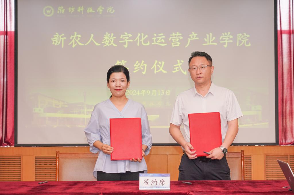 9月13日上午,潍坊科技学院新农人数字化运营产业学院签约暨揭牌仪式在办公楼三楼东会议室举行。寿光市商务局党组成员、商会会长王海涛,寿光市商务综合服务中心主任刘炳欣,好品文化发展(寿光市)有限公司董事长陈志涛,寿光市人才发展集团创新创业中心总经理王浩沣,我校党委委员、副校长张友祥,社会服务处处长于建春,经济管理学院院长丁莹莹,经济管理学院党支部书记于江学等相关负责人及代表参加。社会服务处处长于建春主持签约仪式。
