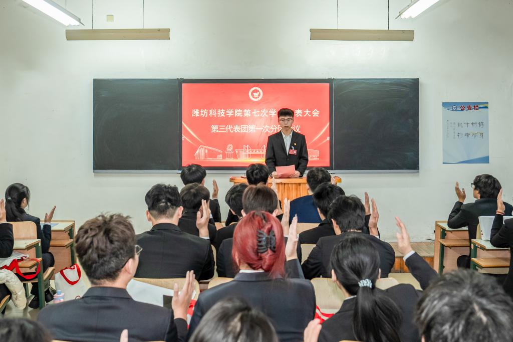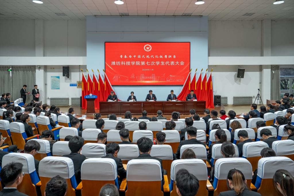 为深入学习贯彻党的二十大和二十届三中全会精神,持续推进学生会组织改革,增强学生会组织生命力,11月6日——7日,潍坊科技学院第七次学生代表大会在经管环形报告厅召开。本次大会的主题是:青春为中国式现代化挺膺担当。学校党委委员、副校长徐友信,学工处、团委全体人员,二级学院党支部副书记、团总支书记,全校327名学生代表参加开幕式。大会还收到了来自山东大学、山东理工大学等32所省内外高校的贺信及贺词视频。