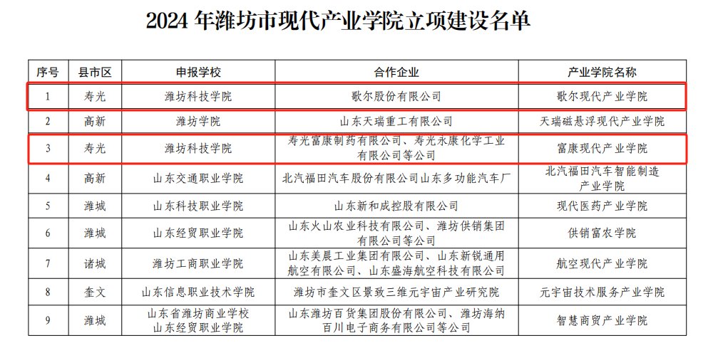 近日,潍坊市现代产业学院建设工作专班办公室发布了《关于公布 2024 年潍坊市现代产业学院立项建设名单的通知》,我校产业学院建设再传喜讯。富康产业学院和歌尔产业学院成功获批市级现代产业学院。至此,学校已拥有5个市级现代产业学院。