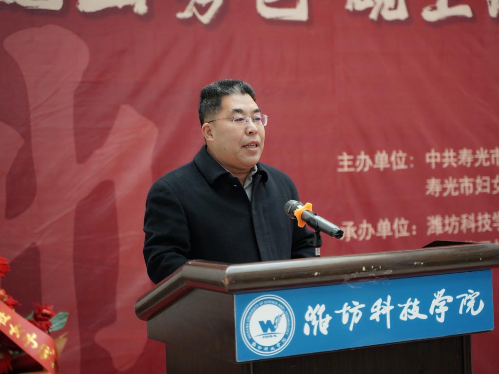 山东省工艺美术协会副会长、潍坊市工艺美术协会党委书记丁传信与寿光市妇联党组书记、主席张林英共同为潍坊科技学院“工艺美术大师工作站”揭牌。