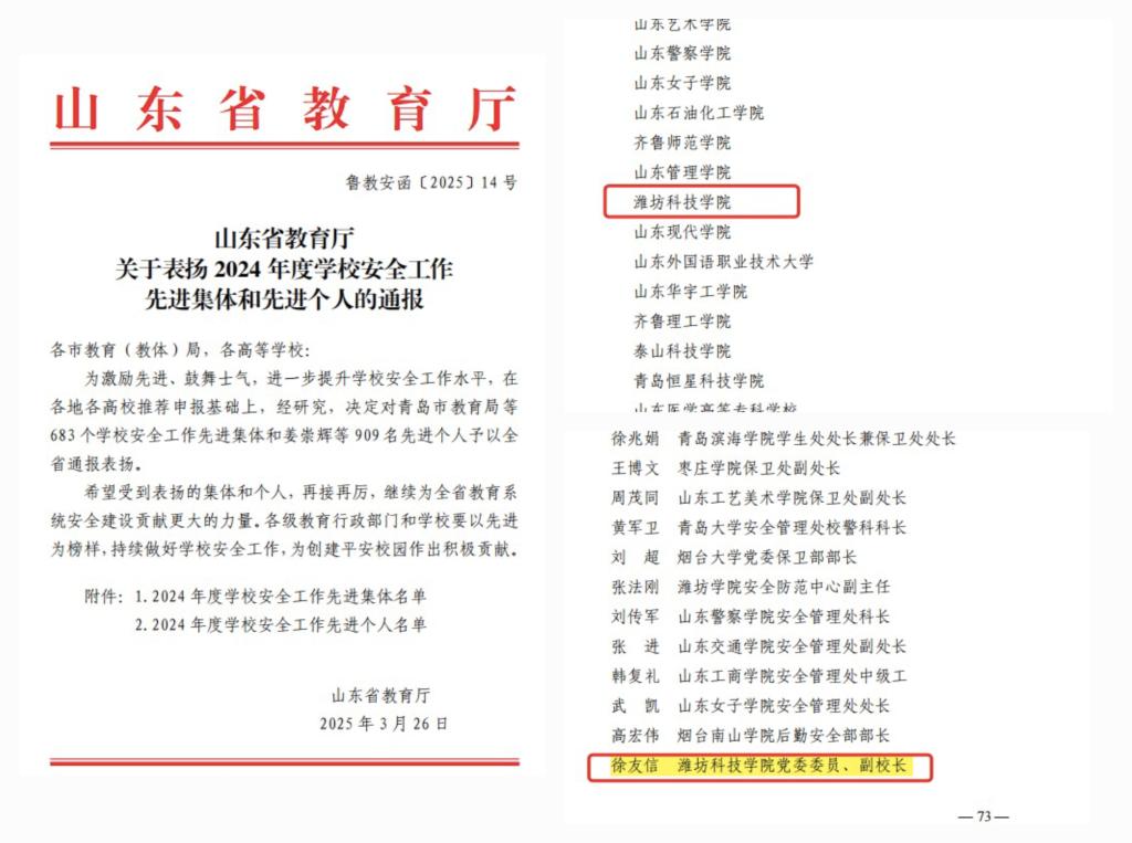 近日,山东省教育厅公布了2024年度学校安全工作先进集体和先进个人表彰名单(鲁教安函〔2025〕14号)。我校获评“2024年度学校安全工作先进集体”,学校副校长、党委委员徐友信荣获“2024年度学校安全工作先进个人”称号。