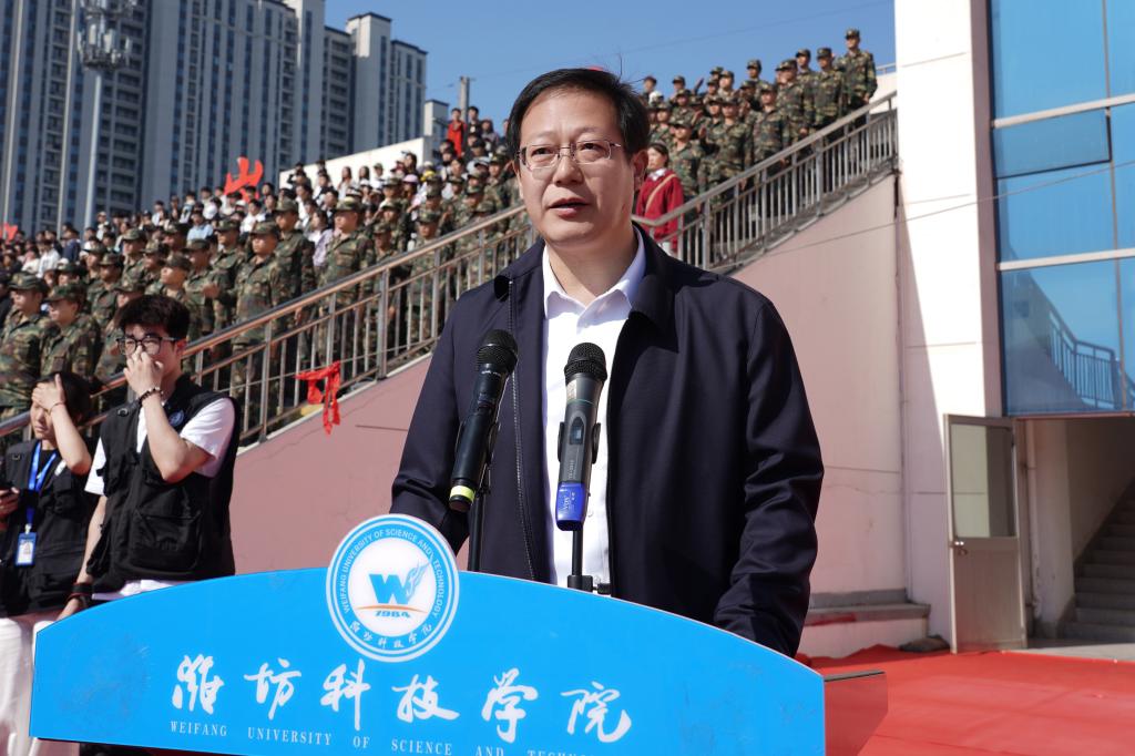 魏华中在致辞中代表学校向运动会的顺利开幕表示祝贺!向筹备组织运动会的师生表示衷心的感谢!向运动会裁判员、运动员致以美好的祝愿!他指出,作为落实立德树人根本任务的关键环节,学校体育教育不仅是提升学生综合素质的根基,更是培育时代新人的重要阵地。作为新时代的青年学子,肩负着实现中华民族伟大复兴的历史使命,而高尚品德、渊博学识、创新精神和实践能力的培养,都离不开强健体魄这一坚实根基。希望全体运动员以此次运动会为契机,大力弘扬顽强拼搏、团结协作的体育精神,将体育锻炼融入日常生活,让强健体魄成为终身财富。在运动中享受乐趣、增强体质、健全人格、锤炼意志,以昂扬向上的姿态,展现出新时代潍科人勇立潮头、锐意进取的卓越风采。他着重强调,运动会不仅是对学校体育教育成果的全面检验,更是全校师生精神风貌与综合素养的集中展现。体育精神,不仅在于对竞技成绩的卓越追求,更在于敬畏规则、尊重对手、团结协作。希望全体运动员坚持“安全第一、友谊第一”的原则,在赛场上挑战自我、突破极限,赛出成绩、赛出水平、赛出风格。