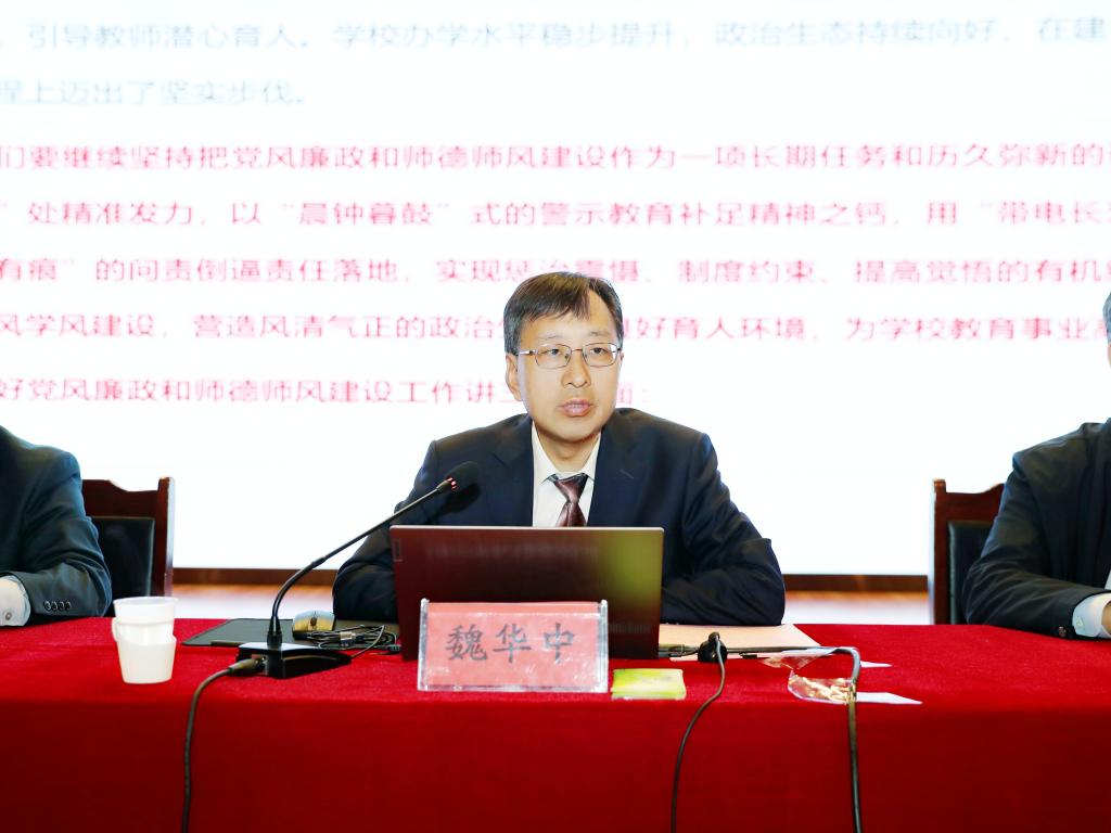 为深入学习贯彻习近平总书记关于党的自我革命重要思想,坚定不移推动全面从严治党向纵深发展,进一步强化我校党风廉政建设,全面提升师德师风水平,4月30日,学校召开2025年党风廉政暨师德师风建设工作会议。学校校长、党委副书记魏华中出席会议并做重要讲话,校党委委员、纪委书记张志军主持,校级领导班子成员、全体科长及以上干部、相关部门全体人员参加会议。