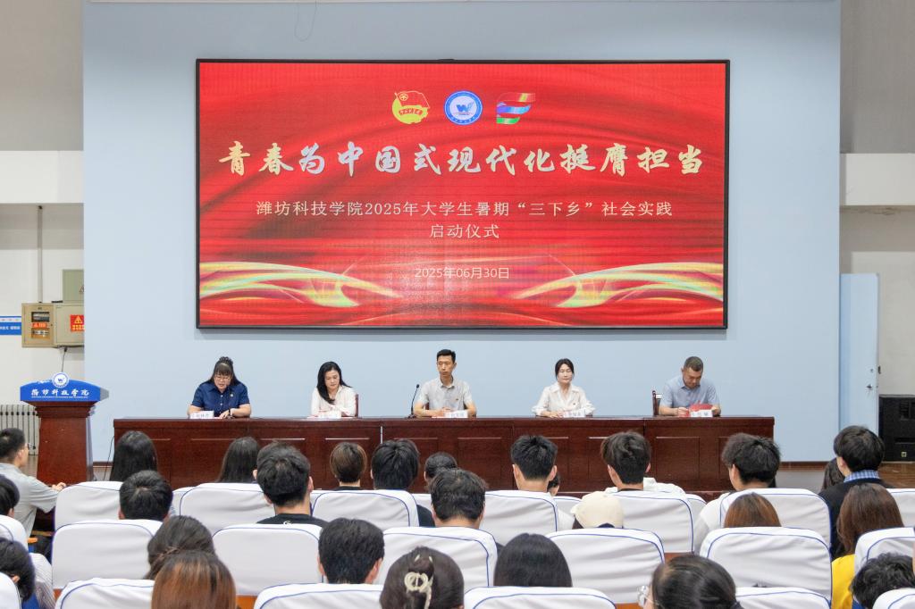 6月30日下午,潍坊科技学院2025年大学生暑期“三下乡”社会实践启动仪式在经管环形报告厅隆重举行。校务委员会委员、学工处处长孙宝国,学工部党总支书记李俊英,团委书记孙一力,团委副书记刘辙、宋林芹以及各二级学院团总支书记、230余名学生代表共同参与活动。