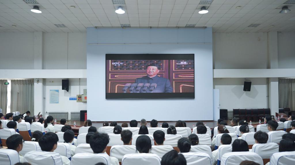 为深切缅怀革命先烈,弘扬伟大抗战精神,进一步激发广大学子的爱国热情与时代责任感,在纪念中国人民抗日战争暨世界反法西斯战争胜利80周年的重要时刻,9月3日,潍坊科技学院团委统筹部署、精心策划,各学院团总支积极响应,组织师生在经济管理学院环形报告厅同步收看纪念大会及阅兵式直播,共同见证历史荣光,感悟精神伟力。