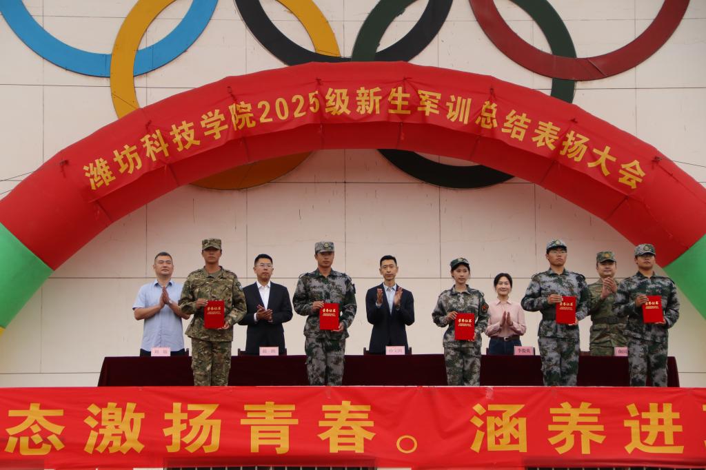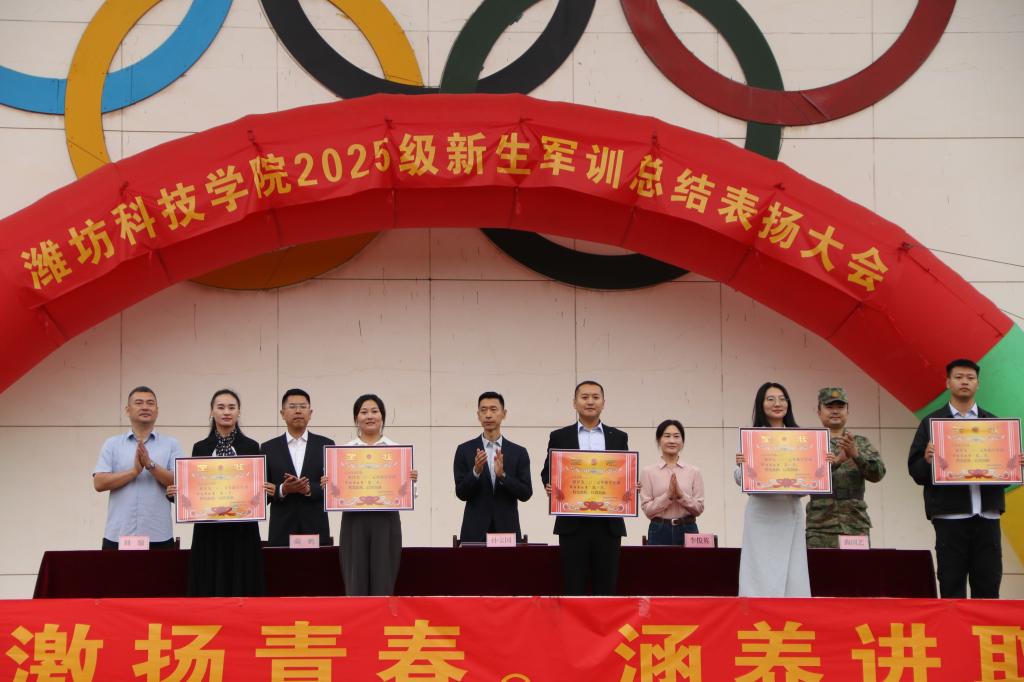 学工部党总支书记李俊英同志宣读《潍坊科技学院关于表扬2025级新生军训先进集体和优秀个人的决定》,对军训期间表现突出的7个“先进单位”、17个“先进连队”、66名“优秀教官”、106名“优秀学员”及各类比赛获奖集体进行表彰,并现场为受表彰代表颁发荣誉证书。