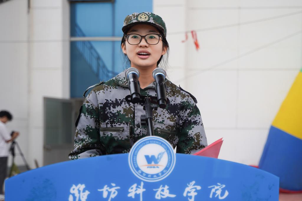 教育学院新生裴佳诺作为学生代表发言。她向辛勤付出的教官、老师及保障人员致以感谢并表示,全体新生将会把军训中收获的坚毅品格、纪律意识与团队精神,转化为大学求学的动力与日常行为的准则,以青春之力在校园书写奋斗篇章。