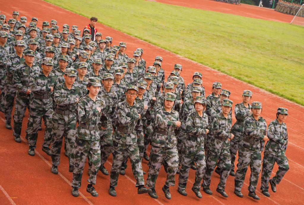 2025级新生以连队为单位依次列队行进。同学们步伐铿锵、精神抖擞,队列严整有序、动作规范统一,将21天军训的扎实成果转化为整齐划一的风采展示,充分展现新时代青年学子的昂扬姿态。