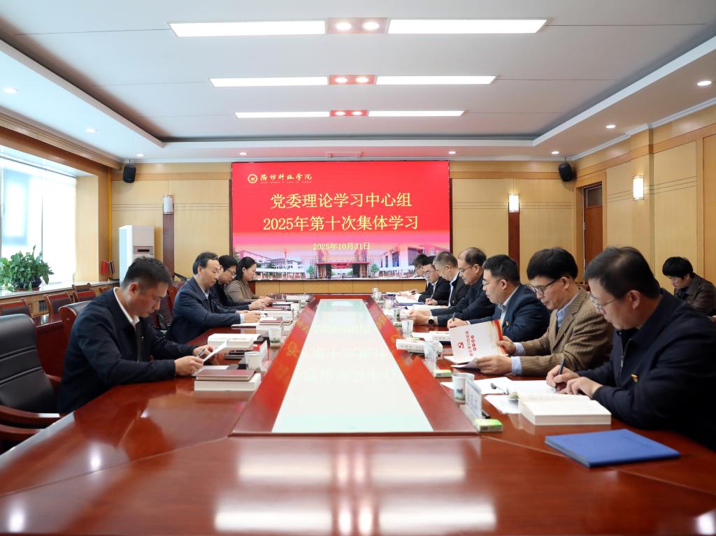 10月31日下午,学校组织党委理论学习中心组2025年第十次集体学习,专题学习《习近平谈治国理政》第五卷关于加强党的建设方面的内容。学校党委书记王洪禹主持会议,党委理论学习中心组成员参加。中共潍坊市委教育工委副书记周书坤、潍坊市教育局学校党建工作科副科长何召远到会指导。