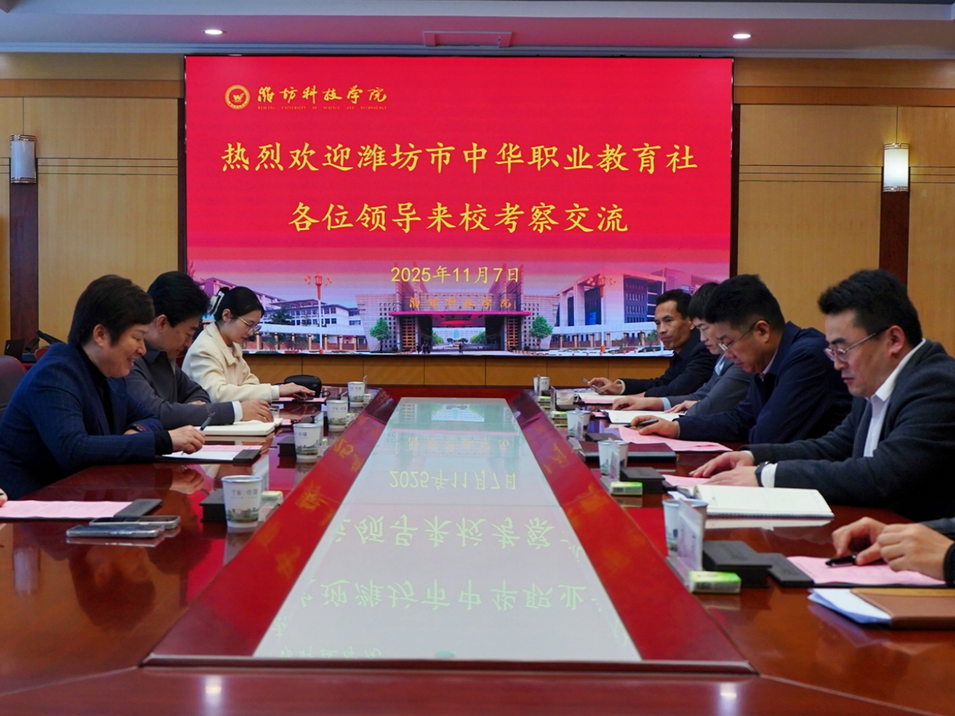 11月7日,潍坊市政协副主席、民建潍坊市委会主委、潍坊市中华职业教育社社委会主任刘秀平一行来校调研交流。寿光市政协党组成员,全国蔬菜质量标准中心党组书记、主任,潍坊科技学院党委副书记、校长付乐启,校党委委员、教务处处长董金萍及相关处室负责人陪同座谈。校党委副书记苗春龙主持。
