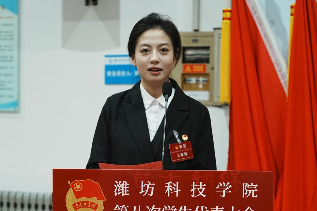 大会在雄壮的国歌声中开幕。王洪禹在讲话中指出,本次大会的召开是在中国人民抗日战争暨世界反法西斯战争胜利80周年的历史坐标下,适逢全校上下深入学习贯彻党的二十届四中全会精神,谋划制定“十五五”事业发展规划之际,具有重要意义。他充分肯定了学生会组织在强化思想引领、服务成长成才、当好桥梁纽带、深化组织改革等方面取得的扎实成效。他希望广大潍科青年自觉用习近平新时代中国特色社会主义思想凝心聚魂,在深学细悟中铸牢信仰之基,在知党爱党中把准青春航向;始终践行“修身、博学、求索、笃行”的校训,既要深耕专业知识、打牢学术根基,也要主动拓宽视野、提升实践能力,在知行合一中锤炼过硬本领,在勤学笃行中积蓄奋进力量;切实筑牢学校与学生间的沟通桥梁,在思想引领上持续发力、在校园文化建设上创新出彩、在权益维护上精准高效、在自身建设上从严从实,在躬身实干中厚植服务情怀,在履职尽责中彰显青年担当;牢固树立政治意识、责任意识、代表意识和大局意识,将个人成长融入学校发展和强国建设的壮阔征程,在锐意进取中勇担时代使命,在奋勇争先中谱写青春华章。他强调,学校正处在申硕和建设应用型品质本科高校的关键进阶期,站在新的历史起点上,学生会组织要以更加开放的格局、更加务实的举措、更加昂扬的姿态,团结带领广大同学在学校高质量发展的征程中注入青春活力,贡献青春智慧。