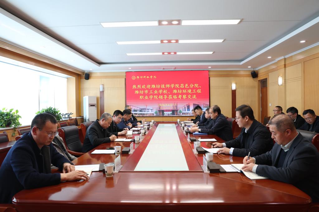4月1日,潍坊技师学院昌邑分院、潍坊市工业学校、潍坊环境工程职业学院一行到我校考察交流。学校党委书记王洪禹,党委委员、学工处处长孙宝国,招生就业处、人事处、教务处等相关部门负责人参加座谈。党委委员、副校长徐友信主持。