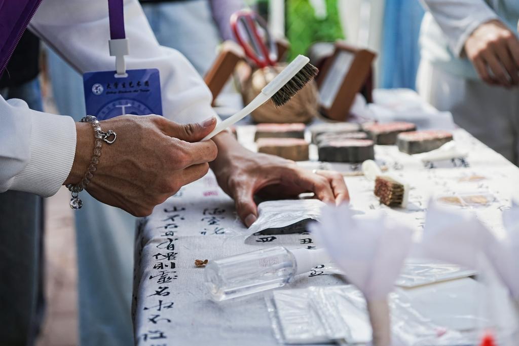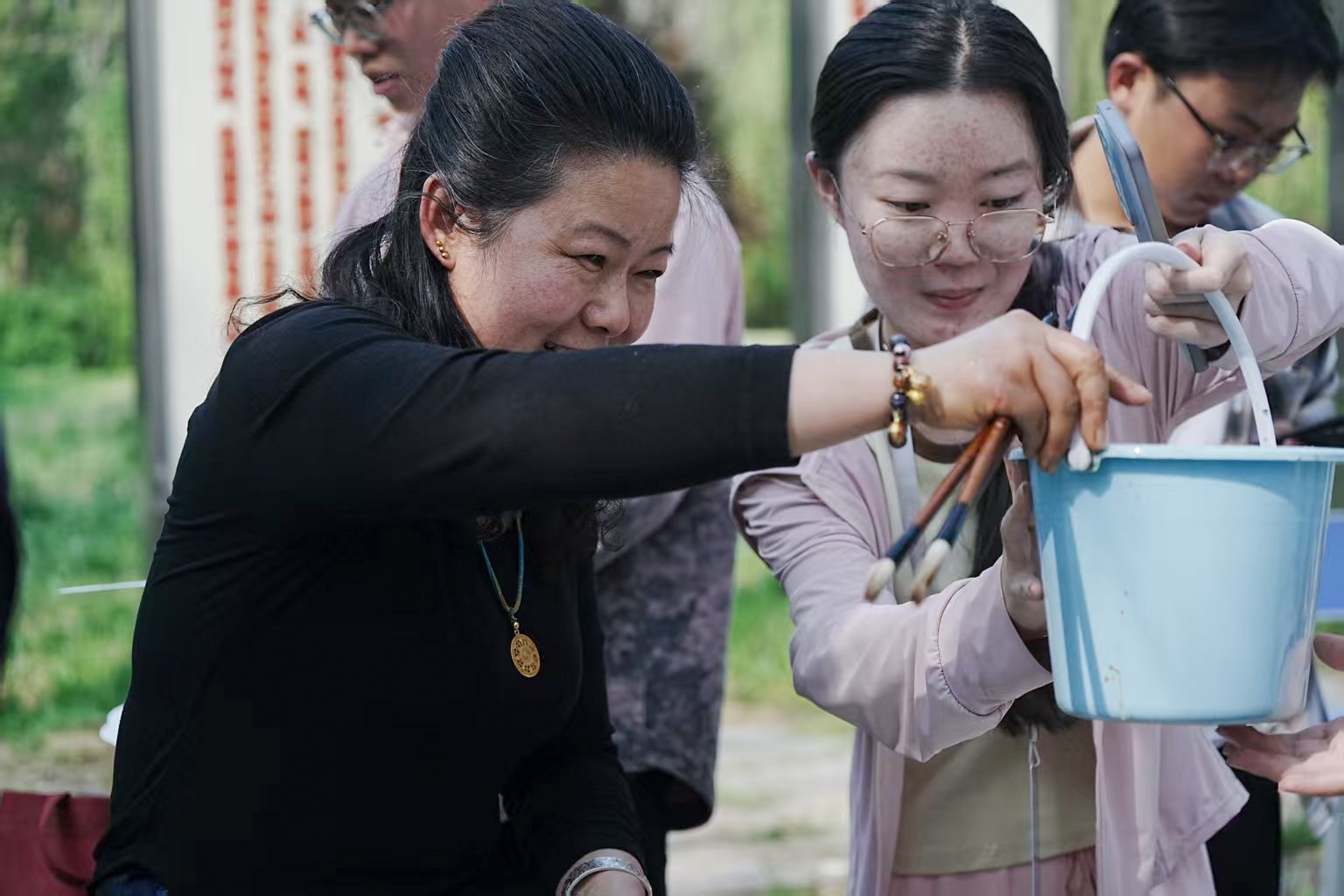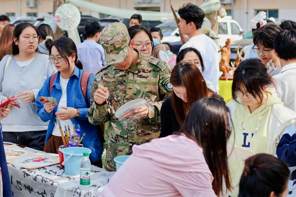 四月的桐园化作流动的锦绣华章,一步一景,满目国风。作为本次活动的核心板块,“非遗匠心展区”以“展示+教学+体验”一体化展位为特色,群星闪耀,精彩纷呈。国家级非物质文化遗产青州花毽传承人李红现场展示花毽绝技,轻盈灵巧的动作引来阵阵喝彩;寿光非遗蓝花布印染技艺代表性传承人董德强指导学生亲手体验扎染过程,感受布上生花的奇妙;紫金陶技艺传承人李继春、木雕艺人甄金强、手绘年画手艺人宁秀梅也纷纷亮出绝活,手把手教学,让同学们在动手实践中感悟传统技艺的文化积淀与创新价值,真正实现了文化体验的知识性与实践性深度融合。