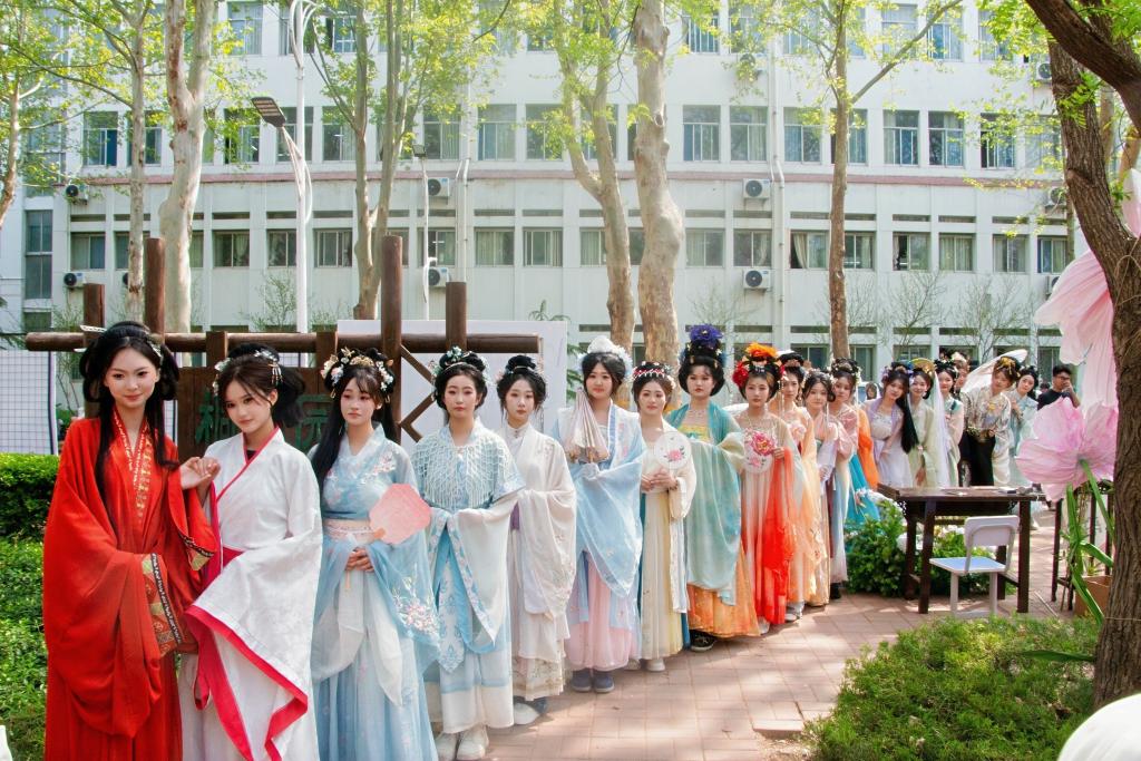 “汉服文化体验区”成为热门打卡地。师生们纷纷试穿华美汉服、学习传统礼仪,在古风布景前拍照留念,沉浸式感受衣冠上国的礼仪之美。汉服形制主题走秀更是将现场氛围推向高潮,24名学生代表身着华服,依次进行形制展示,一招一式间尽显中华传统礼仪的端庄气韵,将礼乐文化的深厚内涵娓娓道来——从战国袍的古朴大气、魏晋交领襦裙的飘逸洒脱,到隋唐齐胸襦裙的雍容华贵、宋制褙子的温润风雅、明制长袄和马面裙的奢华精致等历代经典汉服轮番登场。配合现场专题展板的文字解读,同学们在欣赏华服之美的同时,也能轻松了解不同形制背后的历史渊源、服饰特点与文化寓意。这场集视觉与文化于一体的沉浸式展演,赢得现场师生阵阵掌声,也让传统服饰美学在青春校园里“活”了起来。