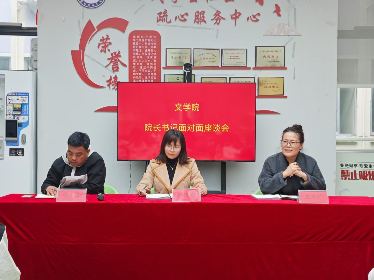 为进一步畅通师生沟通渠道,精准回应学生需求,3月31日,文学院举办"院长书记面对面"一站式服务活动。文学院院长孙淑娟、党支部书记王燕玲、党支部副书记唐玉海与同学们围坐交流,直面学生诉求,进行全方位答疑,切实打通服务学生的"最后一公里"。