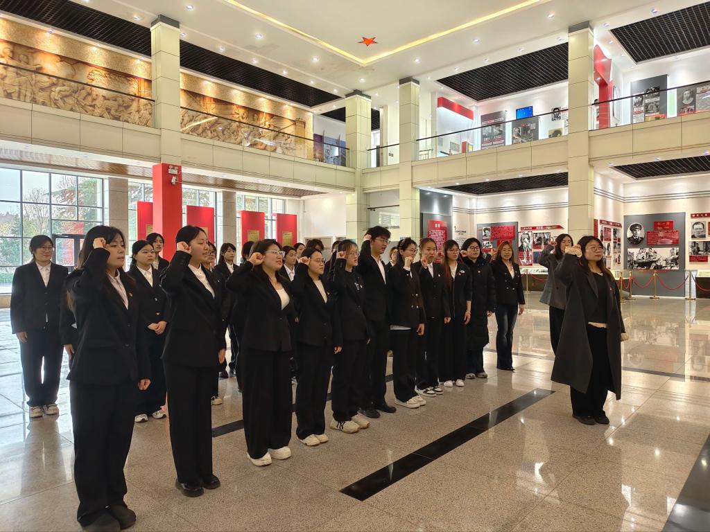 参观结束后,孙凯丽老师带领全体党员面向党旗进行庄严宣誓。誓言铿锵有力,既彰显了党员们坚守信仰、勇担使命的责任与担当,也表达了对革命先烈的深切缅怀与崇高敬意。随后,学院党总支副书记郝磊发表讲话。她指出,缅怀革命先烈是传承红色基因、筑牢信仰之基的重要实践。革命先辈以生命赴使命,用热血铸丰碑,全体党员教师应将红色精神融入教育教学全过程;青年学子要坚定理想、勤学笃行,以外语为桥梁讲好中国故事,以青春担当助力民族复兴伟业。