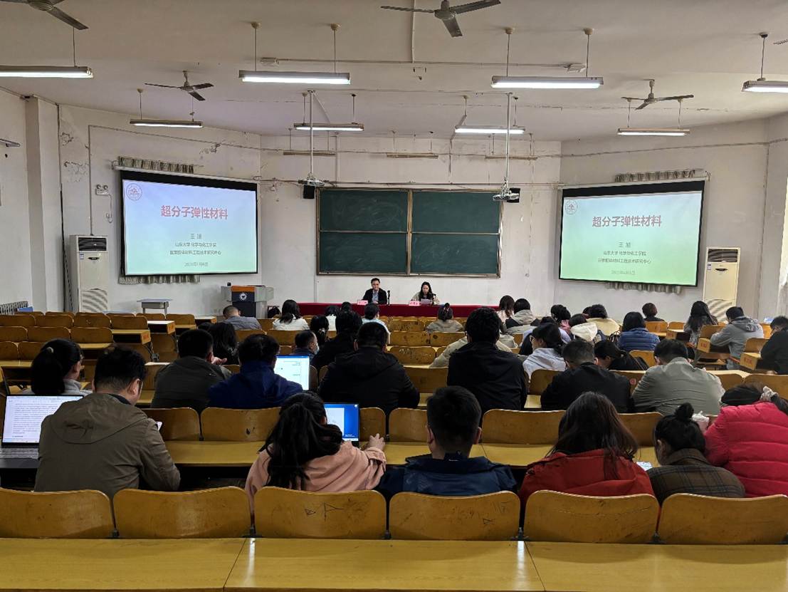 王旭教授围绕研究背景、超分子弹性体、超分子弹性电解质、超分子凝胶材料四大核心板块展开系统讲解。他深入剖析了传统共价键体系材料在可逆性、循环利用等方面的技术瓶颈,创新性地提出以超分子作用取代部分共价键的解决思路,详细阐释了超分子弹性材料“共价-超分子协同”的设计原理。王旭教授结合详实的实验数据、生动的示意图与产业化案例,深入浅出地解读了超分子弹性材料的分子设计、制备工艺及应用前景,为在场教师呈现了超分子化学与高分子材料领域的最新研究进展。