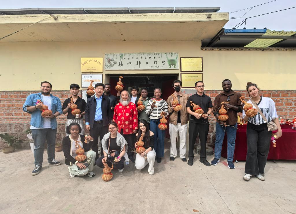 11日上午,“文化交融·友谊共进”座谈会举行。有关单位负责人出席并致辞,肯定了此次交流对推动中外人文交流走深走实的积极作用。会后,中外师生共同参观校园教学设施,体验人工智能学习空间与书法课程,拓展了交流的深度与广度。当日下午,留学生在当地部门协调下,参观柳编、泥塑等非物质文化遗产项目,亲身参与铜拓、扎染等传统技艺实践,深刻感受中华优秀传统文化的深厚底蕴。