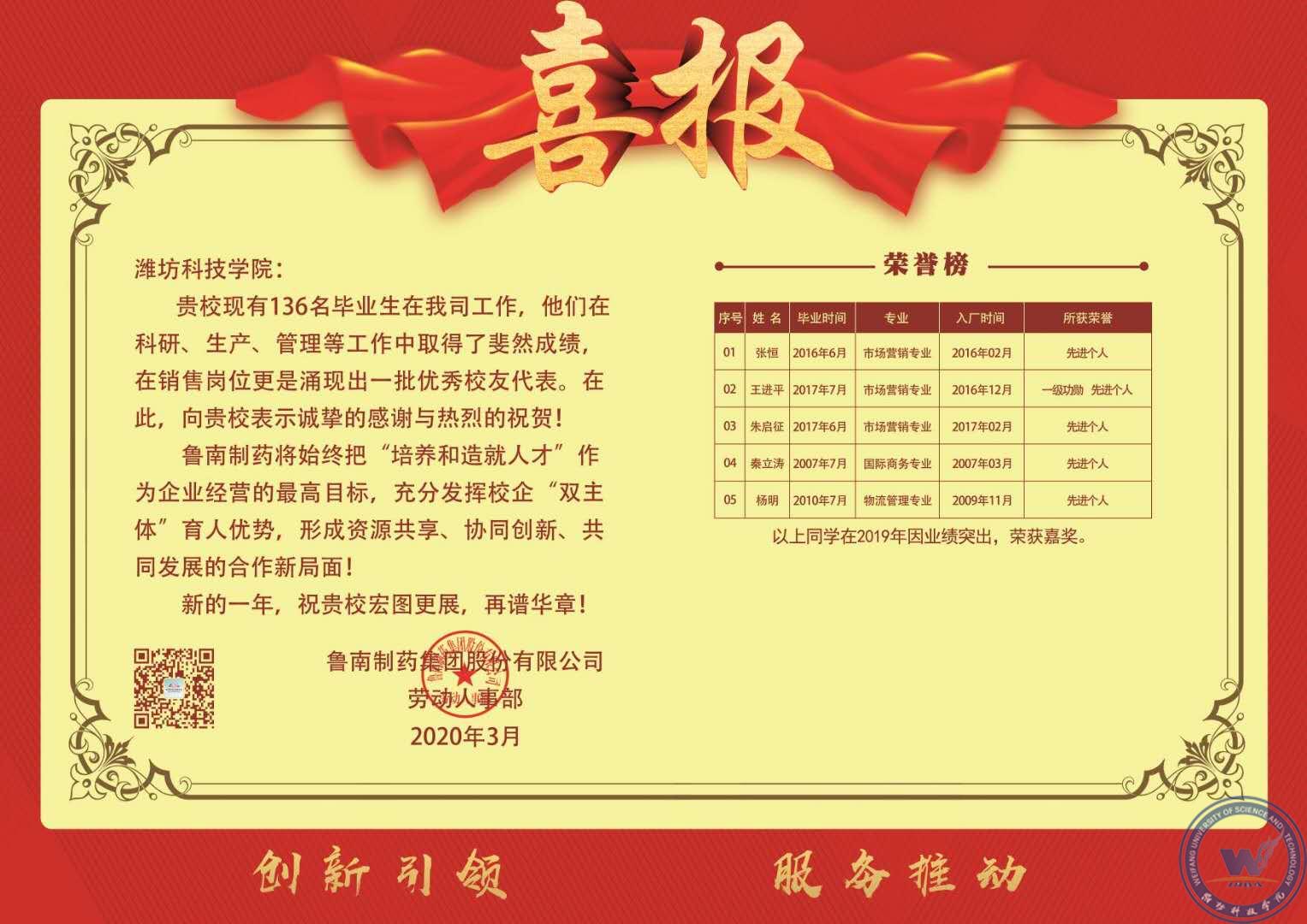 鲁南制药集团是集中药、化学药品、生物制品的生产、科研、销售于一体的综合制药集团,位列中国大企业集团竞争力500强,该单位发来的喜报对我校毕业生在工作中表现出来的工匠精神、创新精神、奉献精神,以及始终保持一流工作水准的品质给予肯定,这是对我校人才培养质量的充分肯定,是对我校学风建设的积极反馈,也是对广大在校生的一种激励和鞭策。