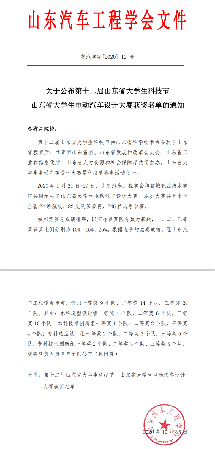 山东省大学生电动汽车设计大赛是第十二届山东省大学生科技节赛事活动之一。本次大赛共有来自全省24所院校的82支队伍,共计246位选手参赛。我校智能制造学院高度重视此次比赛,经过多次校内选拔、培训,最终有5支参赛团队获奖。