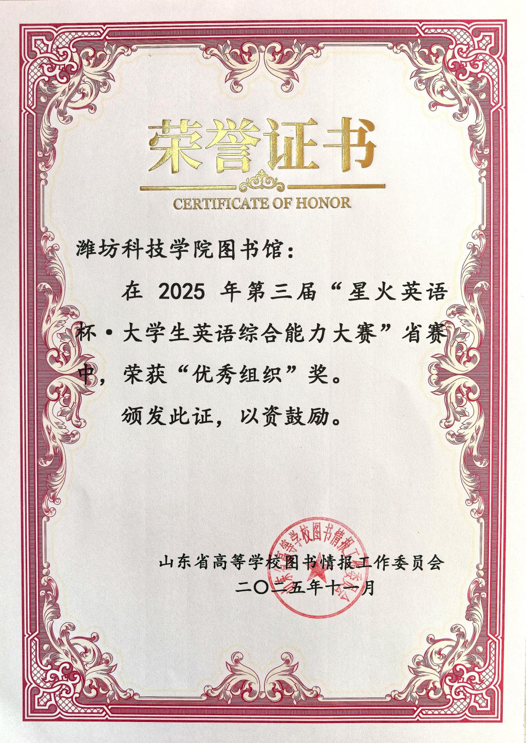 10月30日,第三届“星火杯·大学生英语综合能力大赛”圆满落幕,我校学生钟丽萍、王建蒙分别获二等奖和三等奖,崔晓翠老师获“优秀组织馆员奖”,图书馆获“优秀组织单位”称号。