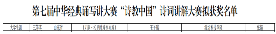 近日,由教育部、国家语委主办的第七届中华经典诵写讲大赛“诗教中国”诗词讲解大赛在北京师范大学珠海校区落下帷幕,文学院张娟老师指导的王子琪同学最终获得国家级三等奖。